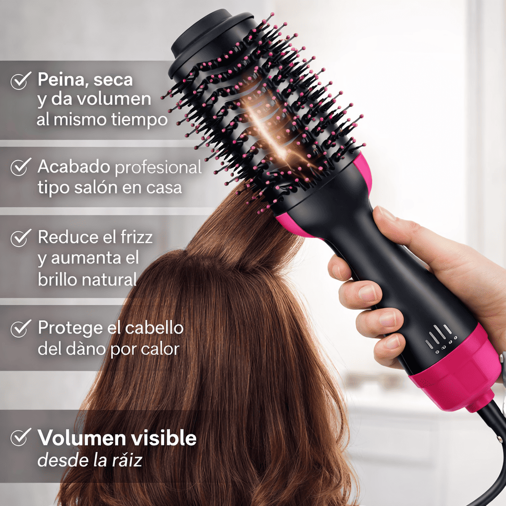 Este innovador cepillo de aire caliente combina secador + cepillo alisador + voluminizador, permitiéndote secar, alisar y dar volumen al mismo tiempo.